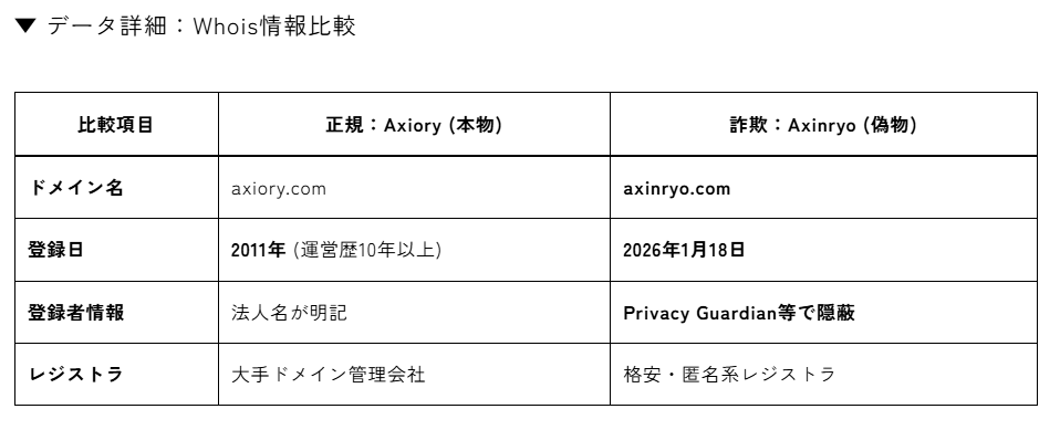 「axinryo.com は、正規の海外FX業者Axioryを装った悪質な詐欺サイト」といった記載があります。