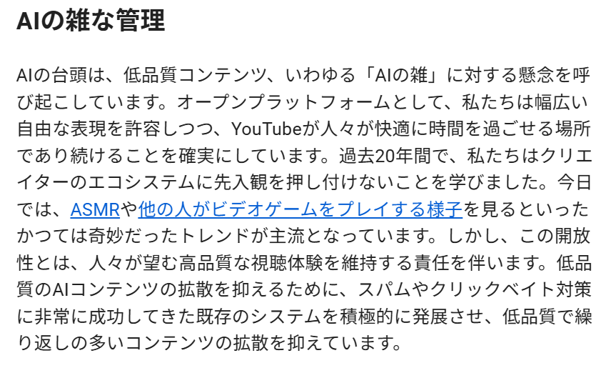 たとえば、「コンテンツ内容の厳格化」でいうと、低品質な生成AIコンテンツを抑制するようになったのも、仕様変更の影響だということができます。