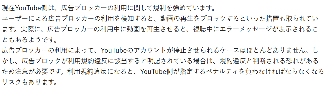 現在YouTube側は、広告ブロッカーの利用に関して規制を強めて」いる、と記載されています。