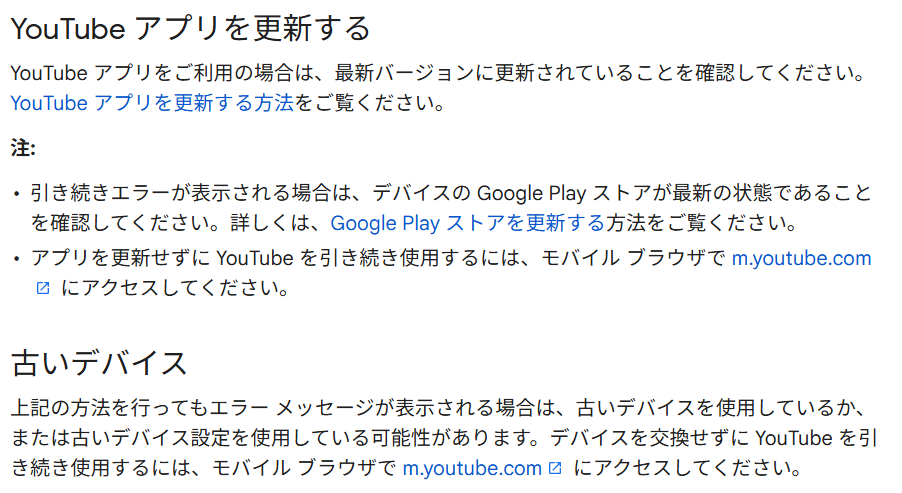 最新バージョンに更新」や「古いデバイス設定」を改善することで、エラーメッセージの表示を防ぐことができると記載されています。